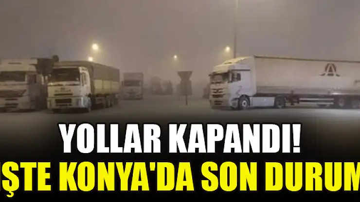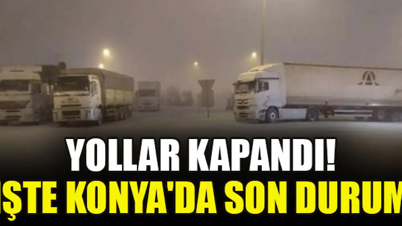 Yoğun kar yağışı ve tipi dolayısıyla; Konya-Ankara, Konya-Aksaray, Konya-Antalya, Konya-Afyon, Konya-Beyşehir ve Konya-Adana Yolu her iki istikamette de trafiğe kapatıldı. Sadece Konya-Karaman yolunun trafiğe açık olduğu öğrenildi..