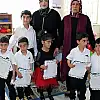 Karne dağıtım töreni sonrası beşizler, okul önünde hatıra fotoğrafı çektirdi.