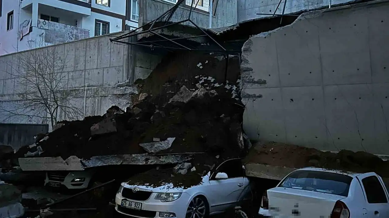 Yozgat'ta istinat duvarı park halindeki araçların üzerine çöktü, 11 araçta büyük hasar oluştu.