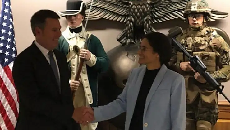 Ensonhaber'deki habere göre, Türkiye aleyhinde küstah açıklamalar yaptırılan İlham Amed, daha sonra Pentagon'da Amerikan bayrağının önünde, yetkililerle samimi pozlar verdi.