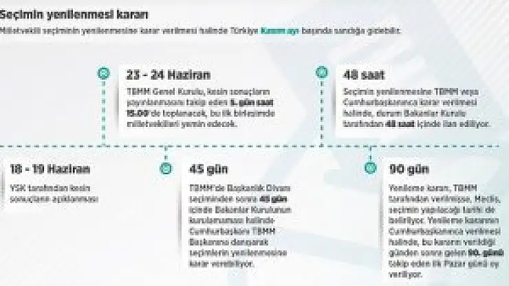 Milletvekili Seçimi Kanunu'nun 8. maddesine göre de seçim dönemi bitmeden önce, seçimin yenilenmesine TBMM veya Cumhurbaşkanınca karar verilmesi halinde, durum Bakanlar Kurulu tarafından 48 saat içinde ilan ediliyor.