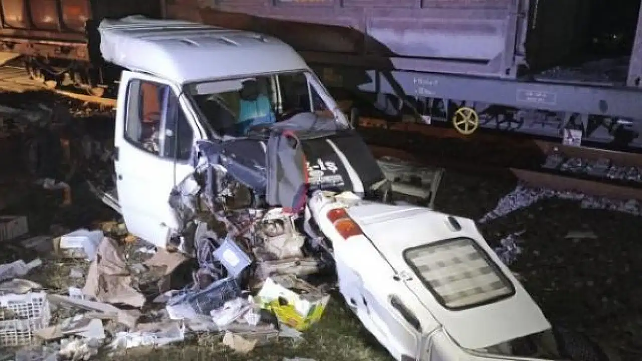 Yük treni ile çarpışan kamyonet ikiye bölündü