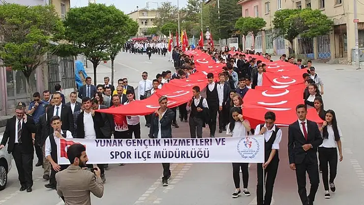 Yunak'ta 19 Mayıs Atatürk'ü Anma, Gençlik ve Spor Bayramı'nın 100. Yıl dönümü ve Gençlik Haftası nedeniyle gençlik yürüyüşü düzenlendi.