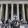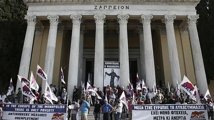 Atina'daki Zapyon Sarayı'nın çevresinde toplanan yüzlerce kişi, "Kirli ellerinizi maaşlarımızdan çekin" ve "İşçi boyun eğme, hakkını alacaksın" sloganları attı.