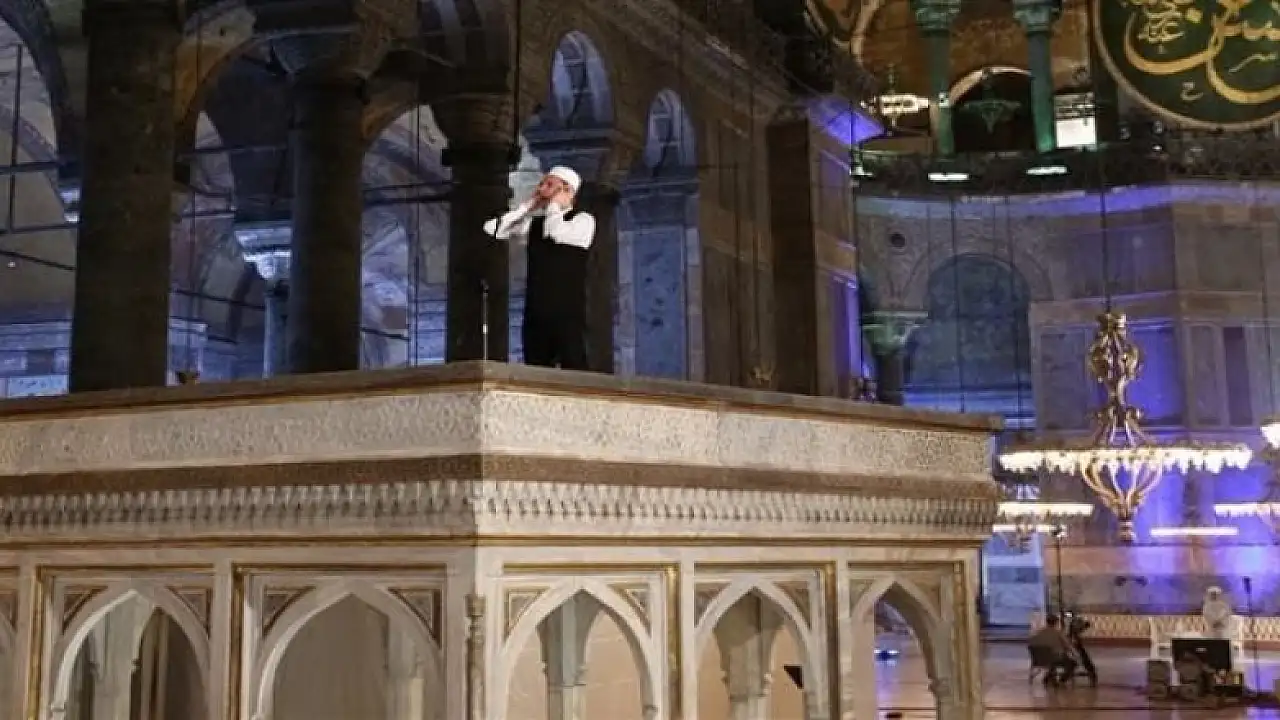 Program TRT Diyanet'ten canlı yayınlanırken, Ayasofya'dan okunan sabah ezanı da Diyanet'in Twitter hesabından paylaşıldı.