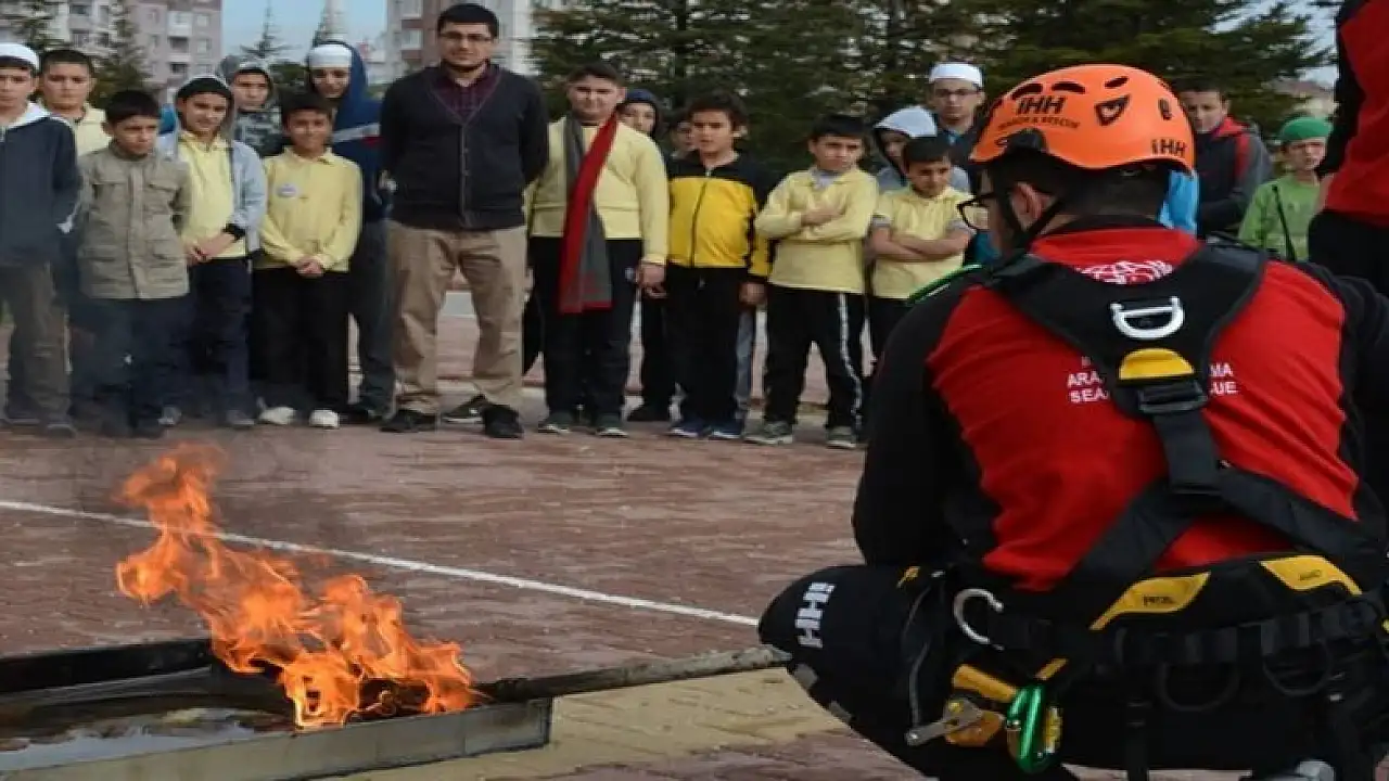 Konya İnsan Hak ve Hürriyetleri (İHH) İnsani Yardım Derneği bünyesinde kurulan Arama Kurtarma Ekibi doğal afetler hakkında öğrencileri bilinçlendirmek için ilk, orta ve lise dengi okullarda 'Temel Afet Bilinci' eğitimlerine devam ediyor.