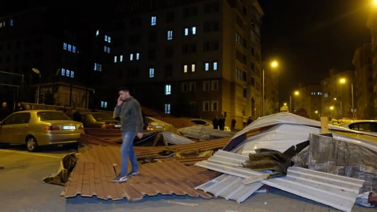 BİNGÖL'de, şiddetli rüzgarda öğrenci yurdunun çatısı uçtu; düşen parçalar, 5 araçta hasara neden oldu. Minarenin uzun süre sallanması ise kameraya yansıdı.