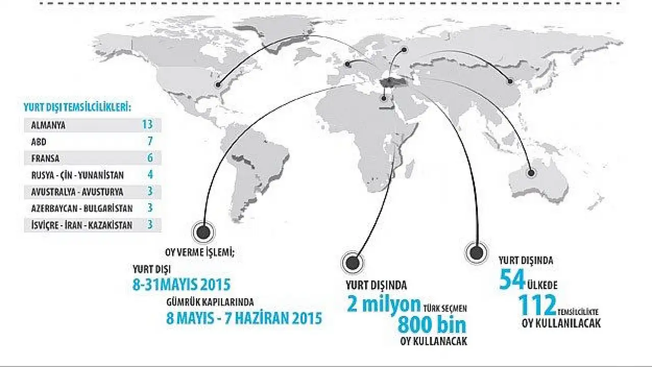 Gurbetçiler, Türkiye'de 7 Haziran'da yapılacak milletvekili genel seçimleri için Avrupa'da 57 noktada, diğer ülkelerde ise ise 55 noktada oy kullanacak.