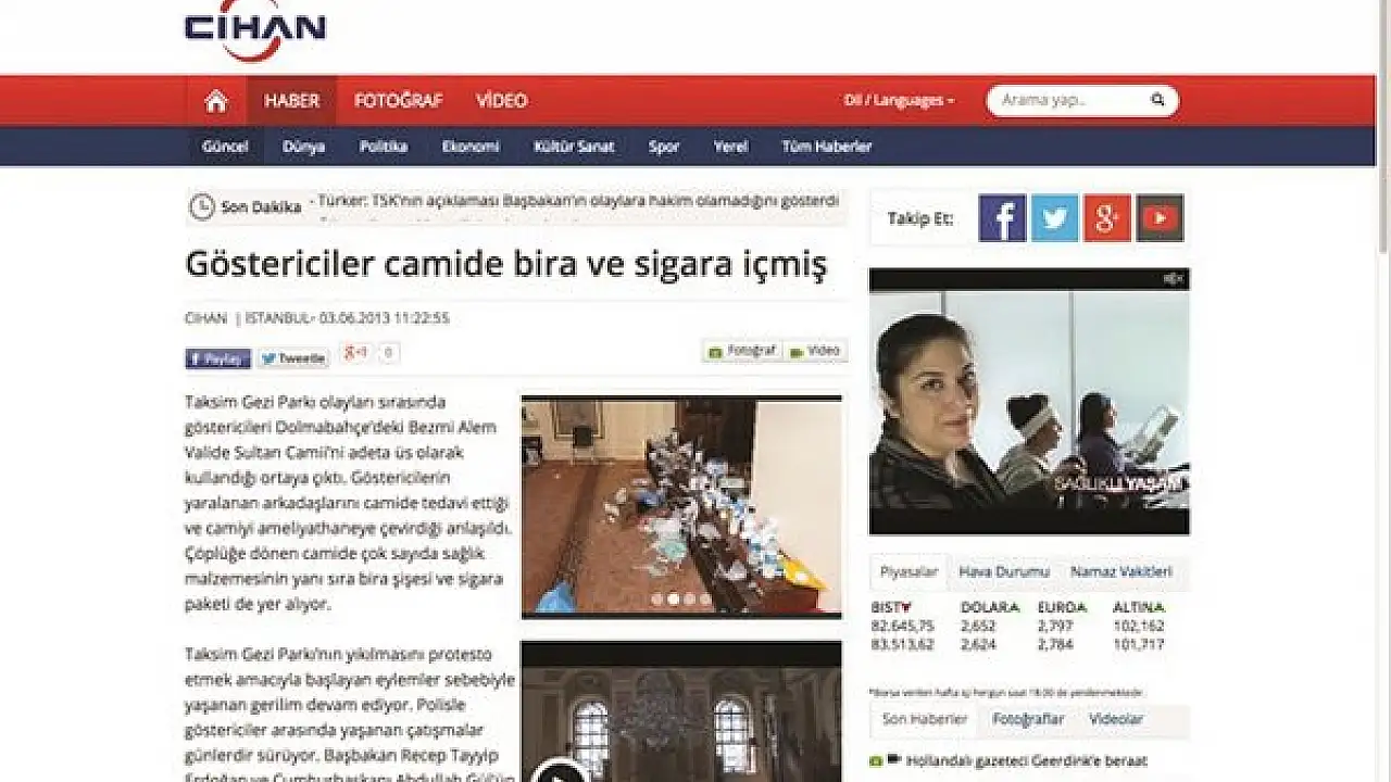 Zaman Gazetesi'nin Pazar ekinde, Dolmabahçe Camii'nde içki içildiğinin yalan olduğu iddia edildi ve söz konusu haberin "10 büyük yalan" arasında yer aldığı savunuldu. Oysa Dolmabahçe Camii'nde içki içildiği haberini kamuoyuna ilk duyuran Cihan Haber Ajansı ve Samanyolu TV olmuştu! Cihan, 3 Haziran 2013 tarihinde "Göstericiler camide bira ve sigara içmiş" haberini servis etmişti.