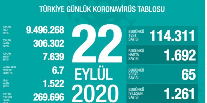 Sağlık Bakanlığının Covid-19 bilgilendirme sayfasında Türkiye'nin güncel korona virüs tablosu kamuoyuyla paylaşıldı. Tabloya göre son 24 saatte 65 kişi korona virüsten hayatını kaybetti, toplam can kaybı 7 bin 639'e yükseldi. Bugün toplam 114 bin 311 test yapılırken, bin 692 yeni vaka tanısı konuldu. Toplam vaka sayısı 306 bin 302 oldu. Bugün iyileşen bin 261 kişiyle birlikte toplam iyileşen hasta sayısı 269 bin 696'e yükseldi. Hastalarda zatürre oranının yüzde 6,7, toplam ağır hasta sayısının ise bin 522 olduğu açıklandı.
