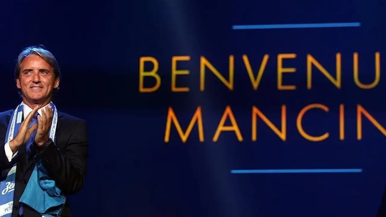 Rusya'nın Saint Petersburg kentinde düzenlenen törende Mancini, takım atkısı ve 'Mancini' yazılı formayla poz verdi.
