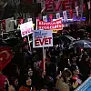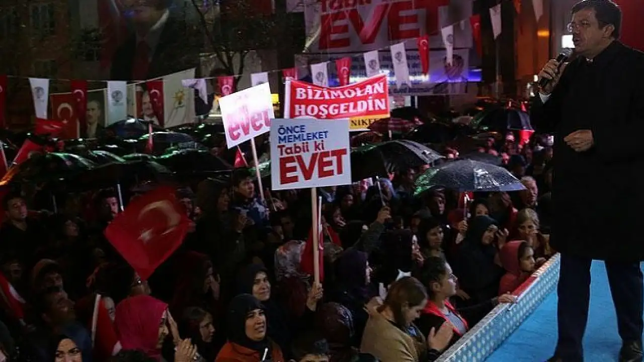 "Siz 'evet' dediniz diye birilerinin dudağı uçukluyor, siz 'evet' dediniz diye birilerinin saçları diken diken oluyor, siz 'evet' dediniz diye birileri gece rüyalarında zıplayıp kalkıyor. Türkiye dünyanın ilk 10 ekonomisinden biri olacak. Hiç bunun kaçışı, kurtuluşu yok. Hapşırsalar da köpürseler de 16 Nisan'da 'evet' diyeceğiz ve Türkiye dünyada ilk 10'da olacak. Bakın etrafımıza, güneye bakın, kuzeye bakın, Avrupa'ya bakın; Allah aşkına niye topyekun saldırıyorlar? Niye topyekun Türkiye'yi hedef alıyorlar? Niye topyekun her birinin hedefinde Recep Tayyip Erdoğan var? Son zamanlarda Devlet Bahçeli de eklendi, ona da saldırıyorlar çünkü 'milletim' dedikleri için ikisi de 'bayrağım' dediği için 'vatanım' dedikleri için ve 'devletim' dedikleri için. 'Bırak namerde, merde bile muhtaç olmayacak Türkiye'ye doğru durmak yok yola devam' dedikleri için."