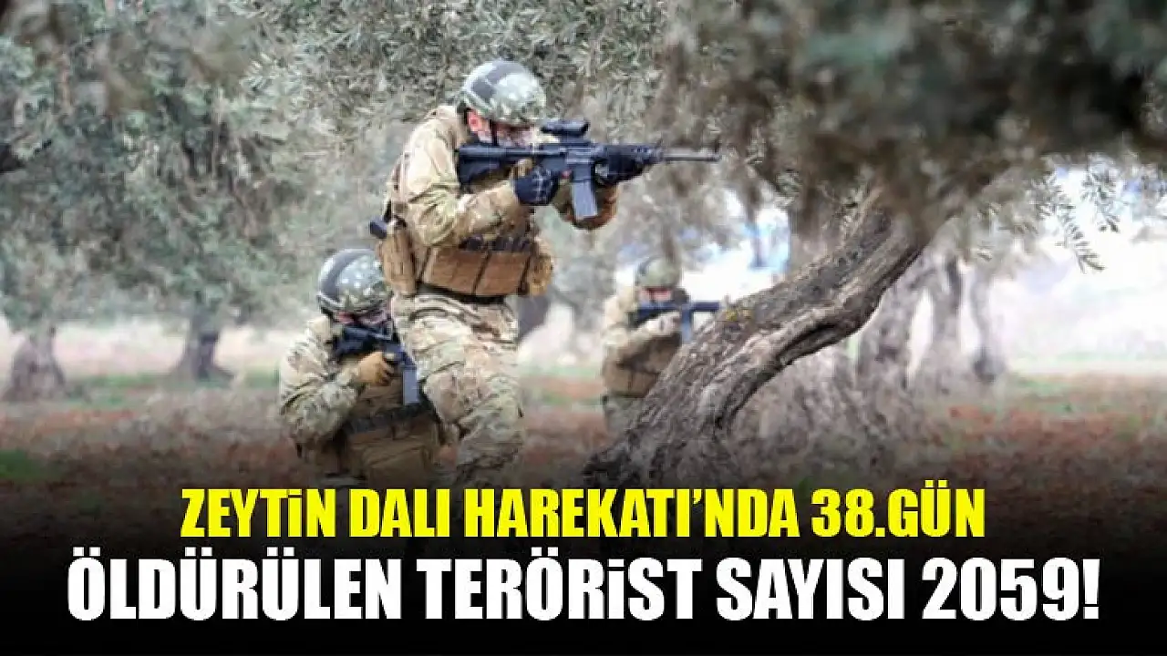 TSK Suriye'nin Afrin bölgesinde yürüttüğü Zeytin Dalı Harekatı, 38. gününde de başarı ile sürüyor. Türk Silahlı Kuvvetlerince, Zeytin Dalı Harekatı'nın başlangıcından bu yana 2059 teröristin etkisiz hale getirildiği bildirildi.