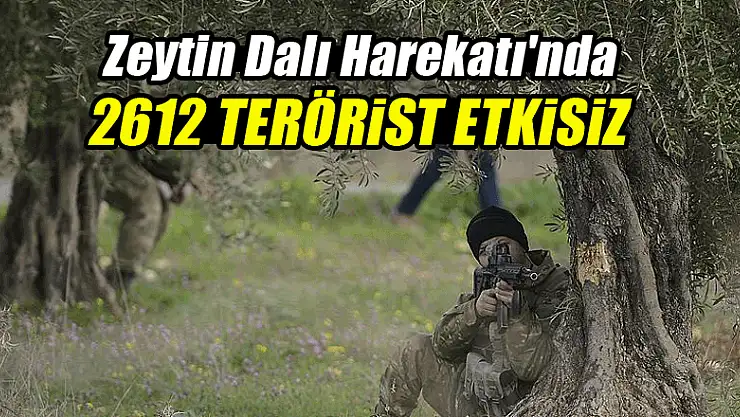 Türk Silahlı Kuvvetlerince, Zeytin Dalı Harekatı'nın başlangıcından bu yana 2612 teröristin etkisiz hale getirildiği bildirildi.