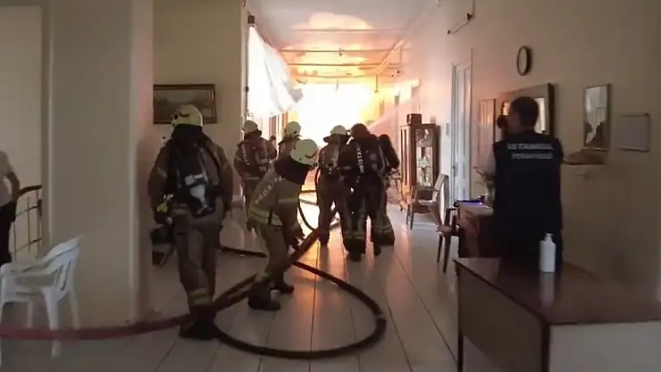 ZEYTİNBURNU'NDAKİ Balıklı Rum Hastanesi'nde çıkan yangın sırasında itfaiye ekiplerinin içerideki müdahalesi kameraya yansıdı.