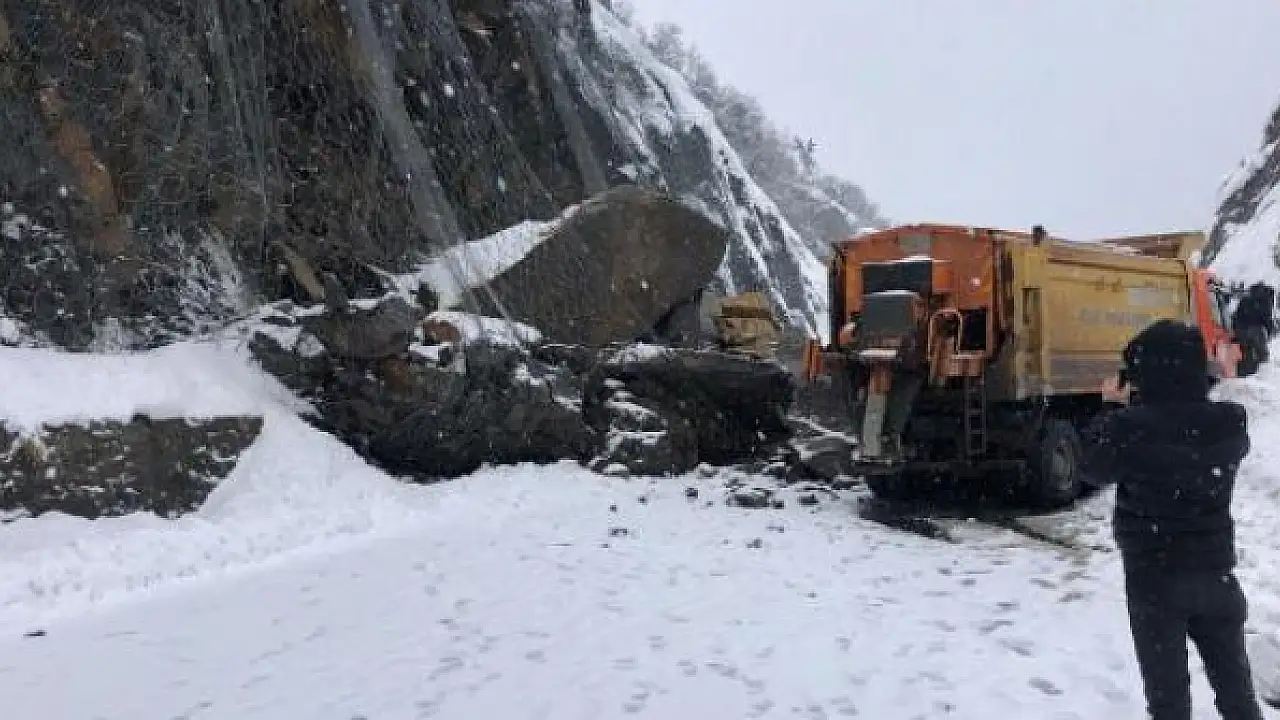 Bu sırada yoldan geçen Karayolları'na ait kar küreme aracına da kayalar isabet etti, sürücü hafif yaralandı. Sürücü hastaneye kaldırılırken, polis ekipleri yolu ulaşıma kapattı.