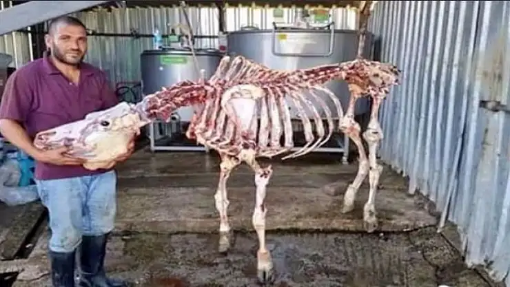 Kocaeli'de bir kasap, iskeleti hiç bozmadan hayvanın etini sıyırdı. Yetenekli kasap daha sonra iskeletle poz verdi.