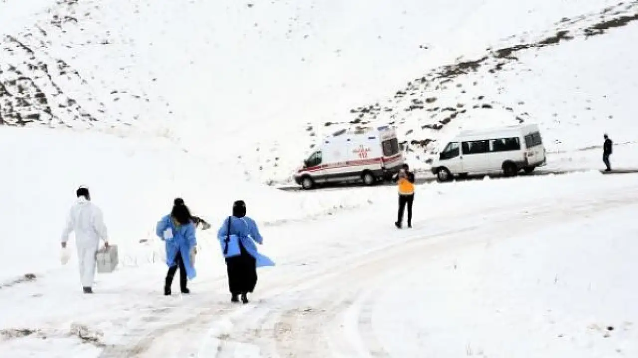 Yolda kar nedeniyle araçlarla ilerleyemeyen sağlık ekipleri; fırtına, tipi ve dondurucu soğuğa rağmen 2 kilometre yürüyerek mezraya ulaştı.